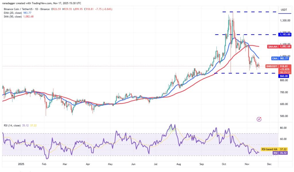 BNB تلاش می‌کند بالای 860 دلار بماند اما انتظار می‌رود هر بازگشت به EMA20 در 983 دلار با فشار فروش مواجه شود.