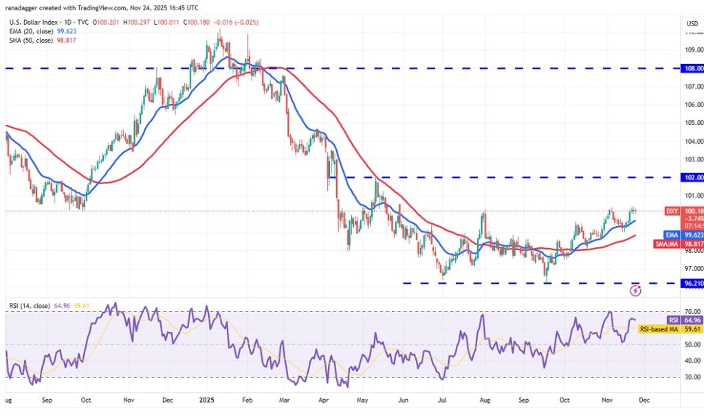 فروشندگان برای تضعیف حرکت صعودی باید قیمت را به زیر میانگین متحرک نمایی ۲۰ روزه (۹۹.۶۲) بکشانند. سپس شاخص میتواند به میانگین متحرک ساده ۵۰ روزه (۹۸.۸۱) کاهش یابد.